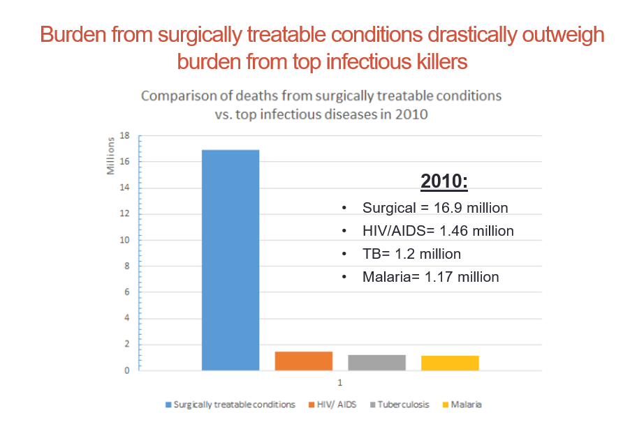 The staggering global burden of surgical conditions is one reason. Today there are five billion people who do not have access to the safe, affordable surgical and anesthesia care they desperately need. In high-income countries like ours, nearly 15% of the population cannot access needed surgery, but in low and lower-middle income countries the burden is much more dire, with an estimated 94% of the population unable to access this type of care (Lancet).